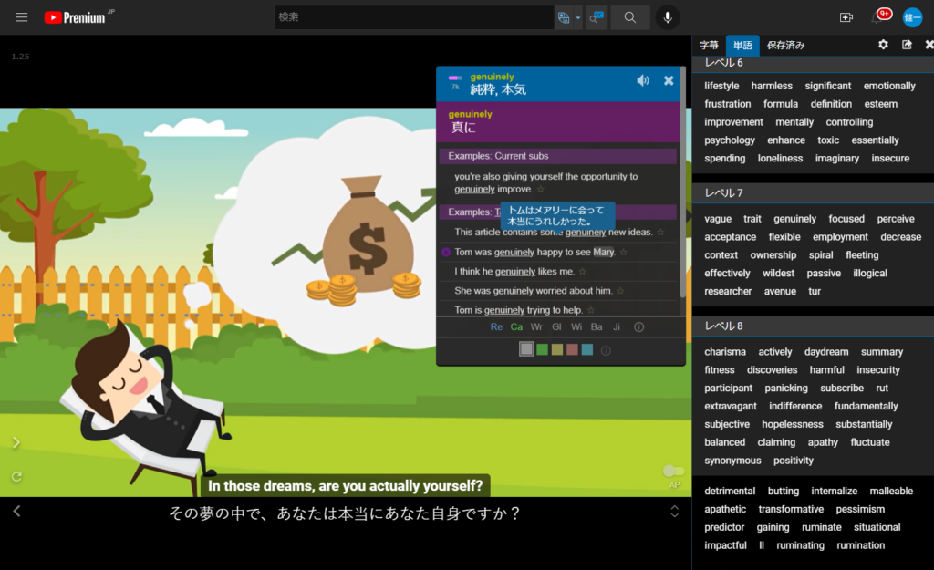 Furthermore, when you click on a word, a Japanese translation and example sentences appear.